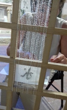 ces signes seront insérés dans la chaîne d’un tissage pour composer une suspension…. Chacun travaille sur un petit cadre qui est fourni.